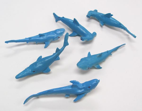 An assortment of six small rubber sharks with suction cups. Each shark is approximately 4 inches in length. Use as you wish. Nice quality.
