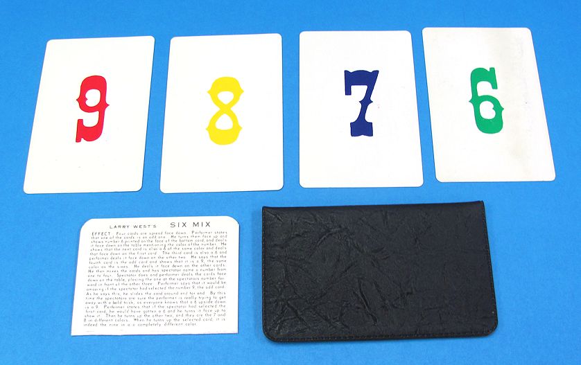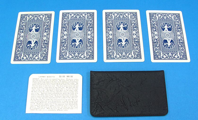 This came from an old magician’s estate purchase. Comes with the four cards, vinyl wallet, and the original instructions. The green six has staining on its face. The other cards are like new.