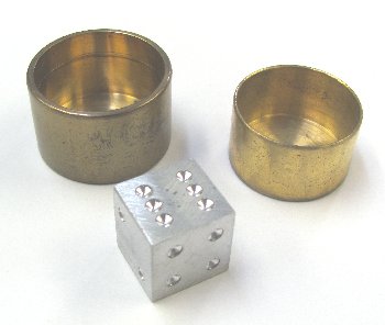 Effect: A round metal brass box, its top, and a single aluminum metal die are shown. A chosen spectator is given the box to hold behind their back. They are then given the die and told to place it inside the box behind their back. Lastly, they are given the cover and told to place it on the box concealing the die.